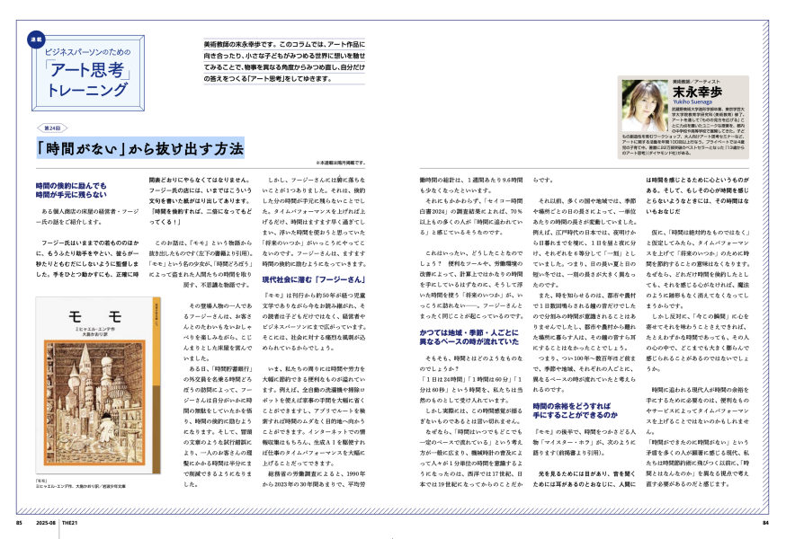 未分類 【連載】THE21(2025/8月号 PHP研究所)ビジネスパーソンのためのアート思考 第24回:「時間がない」から抜け出す方法 2025.07.10 【連載】和田彩花 × 末永幸歩|世界をひろげるアートのミカタ#4(QUI) 前の記事 【インタビュー】マーケティングの世界の住人が、アートの世界を覗いてみた。No.9 末永幸歩さん(電通報) 次の記事
